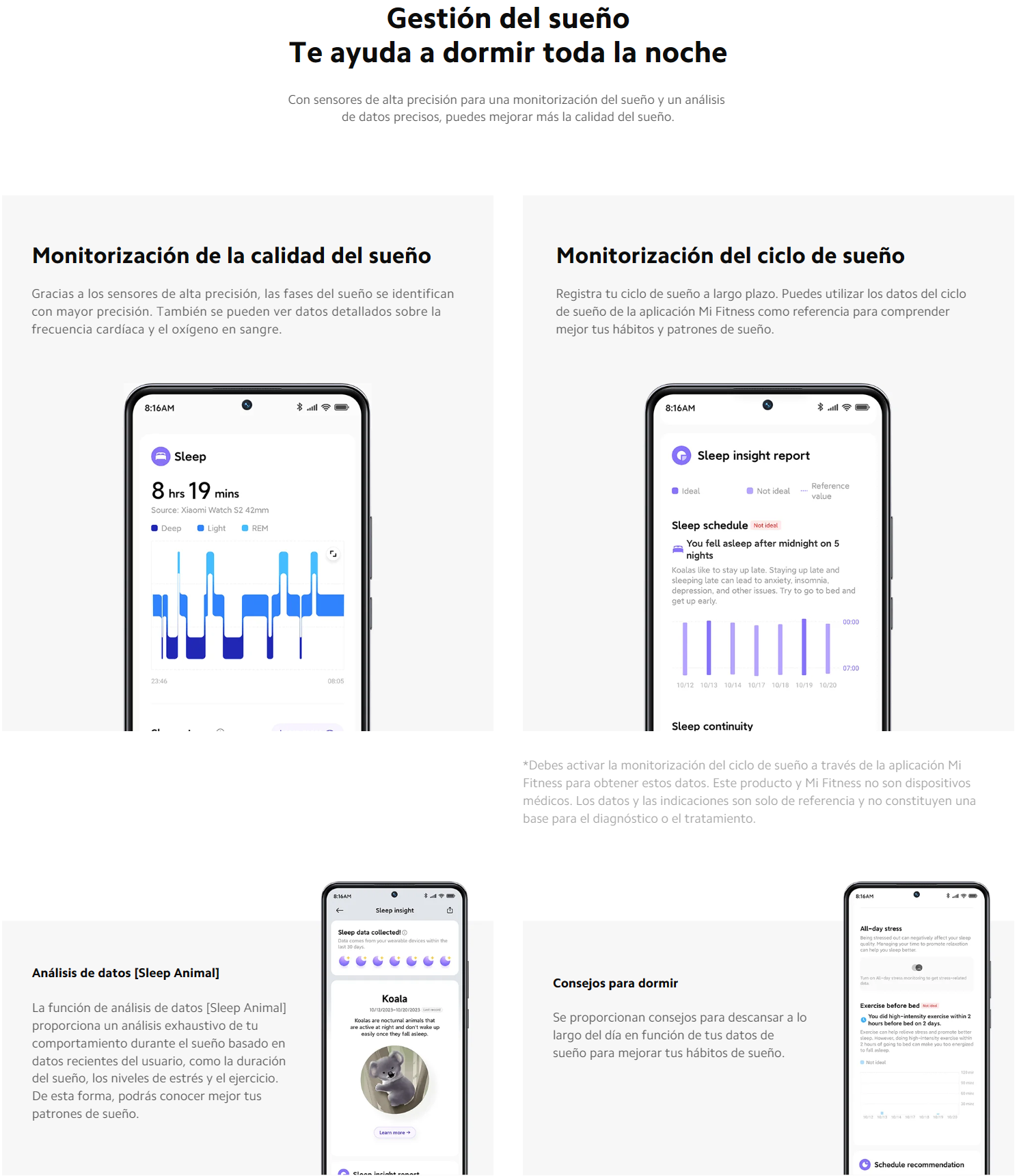 • Seguimiento de salud avanzado: Monitorea tu frecuencia cardíaca 24/7, niveles de oxígeno en sangre (SpO2), calidad del sueño y niveles de estrés.